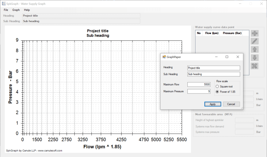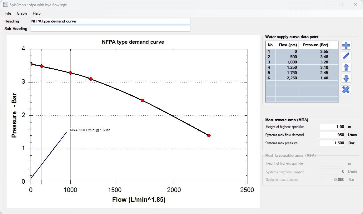 spkGraph can simplify this process by allowing the design to add a few points from the pump curve, the most favourable design point and the height of the height's sprinkler in the most favourable area. spkGraph will plot the pump curve and the system demand line and calculate the maximum flow demand for the system.